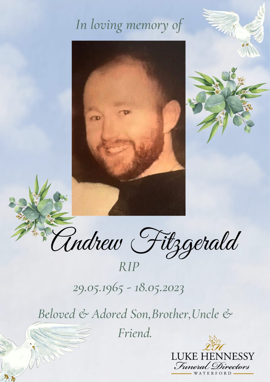 Book of Condolence: A message of sympathy can be left for the Fitzgerald family in the condolence section below. The family appreciates your sympathy, support and understanding at this difficult time. Mass cards can be posted to Luke Hennessy Funeral Directors, St. Ursula’s Tce, Waterford.