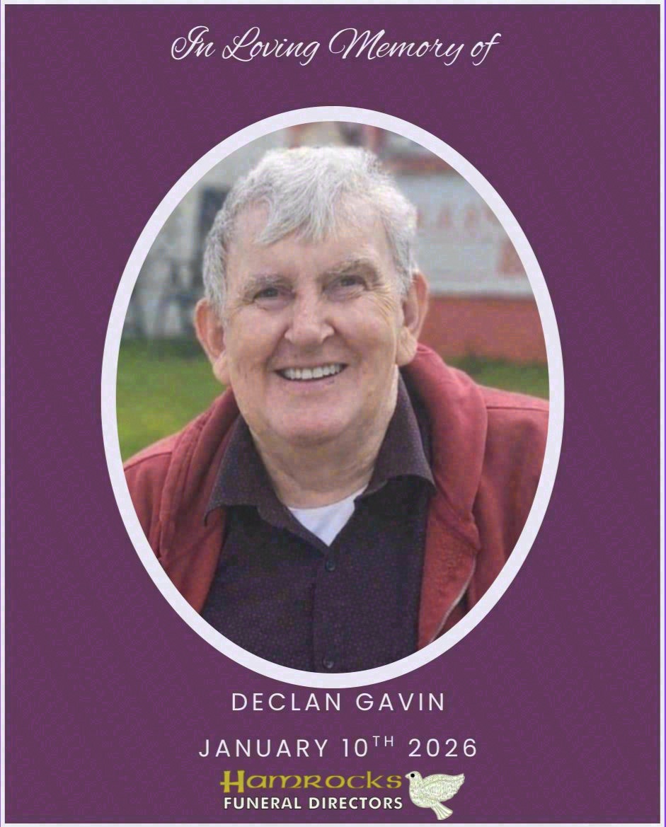 Declan Gavin, Curramore, Kiltoom, Athlone, Co. Roscommon, Saturday, January 10th, 2026, peacefully, surrounded by his loving family, in the tender and loving care of the staff of Central Park, Nursing Home, Clonbern, Co. Galway.