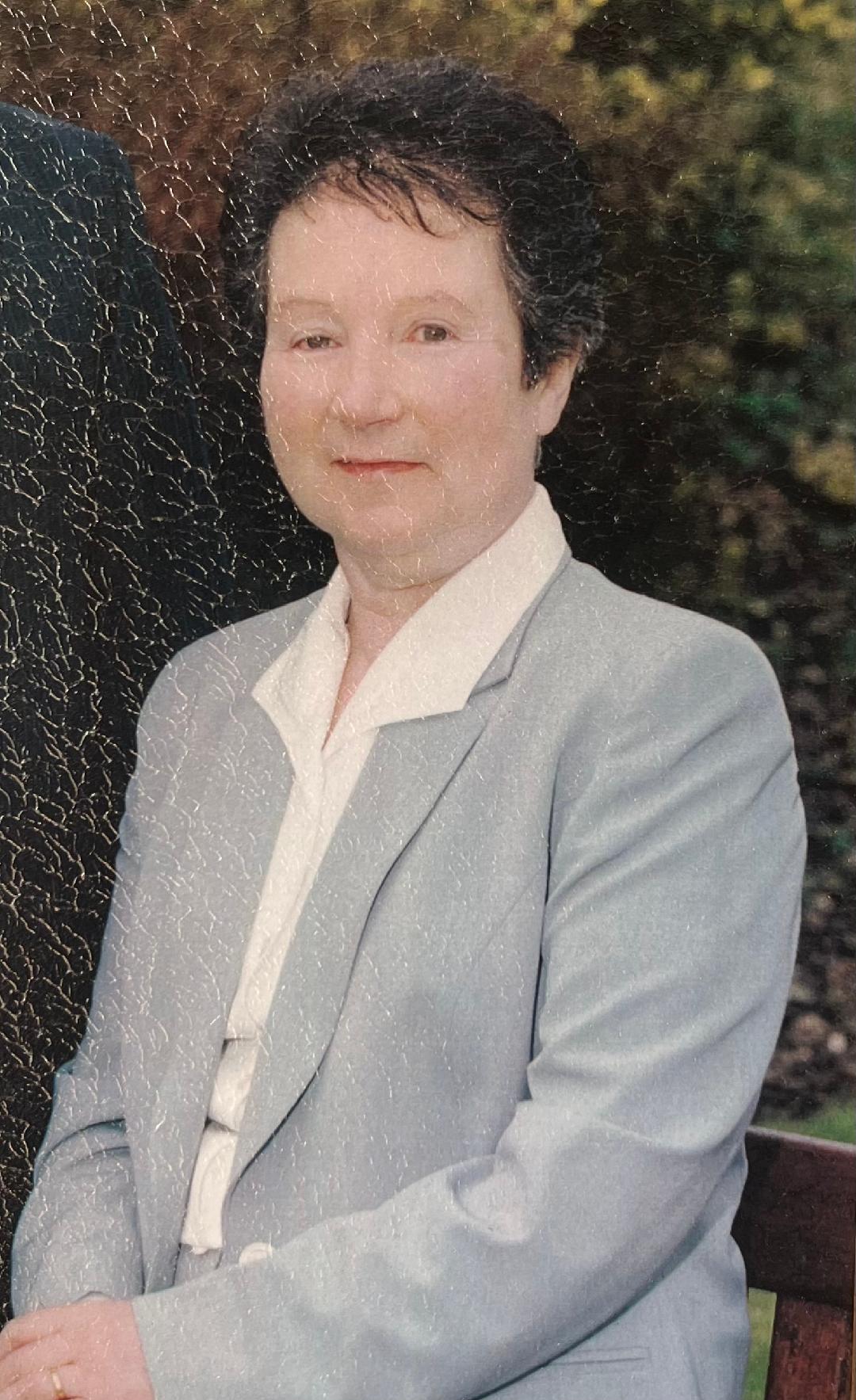 Predeceased by her husband Benny. Sadly missed by her sister Peggy (& family) and Julia Plunkett. Beloved mother of Sean (Betty), Pearl (James), Pauline (Tony), Pat (Rosie), Ann Marie (Noel) and Barry (Yvonne). Deeply regretted by her beloved grand children Ryan, Conor, Stephen, Owen, Áine, Luke, Ben, Alannah, Cliona, Darragh, Laura, Paul, Leanne, Harvey, Cohen, Fiadh and her great grand child Finnbar.