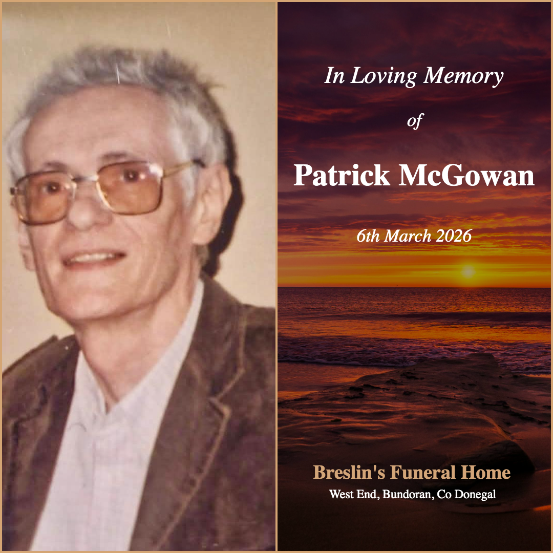 Reposing at Breslin’s Funeral Home, West End, Bundoran eircode F94E92F from 5pm until 7pm.