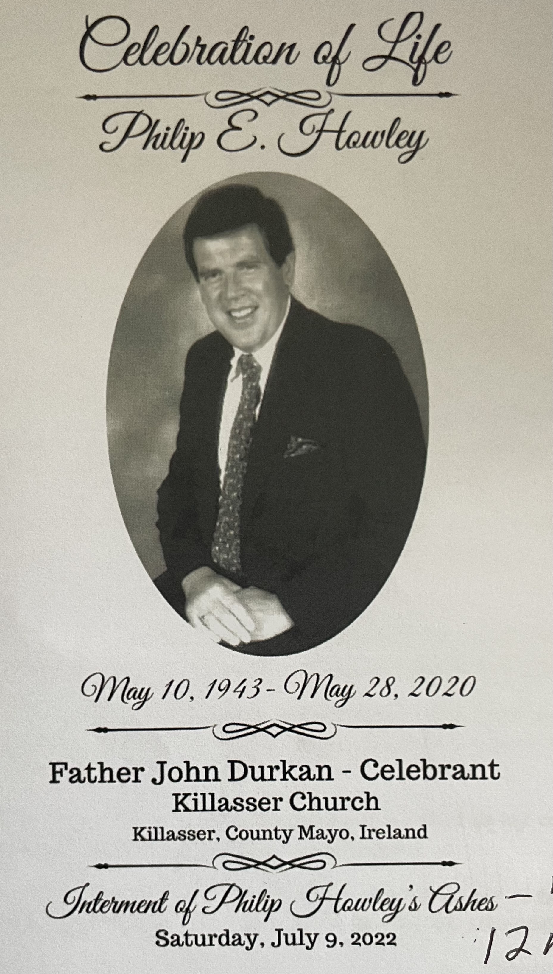 Philip Howley, Carramore-Moy, Killasser, Swinford, died 28th May 2020. Beloved husband of Anna Howley, father of Julie Loftus (Philadelphia), Philip (Killasser), brother of Maureen Byrne (Bohola) and Martin Howley, (Blackpatch, Killasser and Philadelphia).