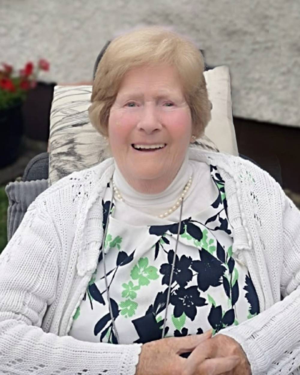 She will be sadly missed by her daughter and sons, grandchildren Amber, Jordan, Luke, Meadow, Andrea, Liam, Brendan, Noel, Donal, Sean, Andrew, Stephen, Shauna, Rebecca, Emma, Aiden and Anna, great-grandchildren Isla, Brandon, Saoirse, Jamie and Aria, daughters-in-law, sisters Carmel, Marie and Angela, cousin Bridie, brothers-in-law Liam, Pat and Billy, nieces, nephews, relatives, friends and neighbours.