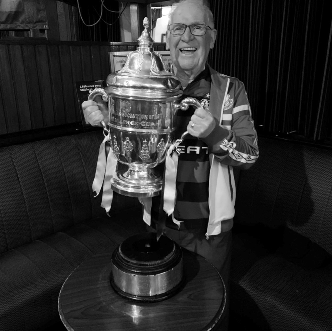 He will be sadly missed by his loving wife and family, sons-in-law Gareth and Keith, daughters-in-law Sandra and Catherine, relatives, friends, neighbours and his beloved Shamrock Rovers family.
