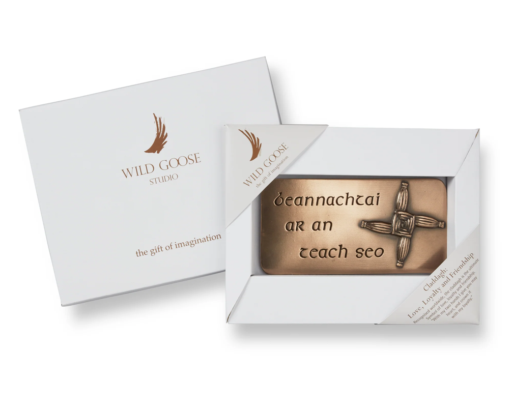 Usually woven from reeds, the St Brigid's Cross is thought to protect the home. This wall hanging comes with the Irish phrase, which means: blessings on this house. There are many folk traditions associated with St Brigid, which are still celebrated in rural Ireland.